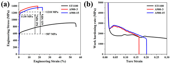 Figure 7a shows the room-temperature tensile curves of the as-solutionized sample and as-annealed samples of the present steel. The ST1100 sample exhibits a yield strength of 587 MPa, a tensile strength of 909 MPa, and a considerable fracture strain of 54.9%, indicating excellent ductility. In contrast, both the A900-3 and A900-15 samples show significantly higher yield and tensile strengths compared to the ST1100 sample, with yield strengths of approximately 1130 MPa and 1218 MPa, respectively, and tensile strengths of 1360 MPa and 1397 MPa, respectively. However, the fracture strains are relatively lower than that of ST1100, measuring 23.0% and 18.4%, respectively. Compared to the hot-rolled solution-treated state, the cold-rolled annealed state provided a remarkable improvement in yield strength, with A900-3 showing an enhancement of 631 MPa over ST1100, while A900-15 exhibits an increase of 543 MPa.