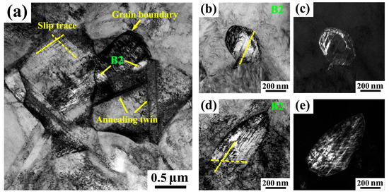 The TEM characterization results reveal the tensile deformation features of the A900-3 sample at 10% strain. Figure 8a shows a bright-field image of the austenite matrix, illustrating the overall deformation of the sample. Slip traces, grain boundaries, and annealing twins can be observed within the austenite matrix. These slip traces are identified as the (11) and (11) planes. The grain boundaries and annealing twins act as barriers to dislocation movement, causing dislocations to accumulate nearby, thereby enhancing strain hardening capabilities. The interactions between dislocations and grain boundaries or twins are crucial factors contributing to strain hardening. Figure 8b,c show the bright-field image and corresponding dark-field images of the interaction between B2 particles and dislocations, respectively. It can be seen that there is a significant interaction between dislocations and B2 particles. B2 precipitates exhibit non-coherent characteristics, and their interface with the austenite matrix (B2/FCC interface) is a significant barrier to dislocation slip. When dislocation motion encounters B2 particles, bending and entanglement occur around the particles, increasing resistance to dislocation motion and resulting in strain hardening. This interaction between dislocations and B2 particles is considered a key factor in achieving high strain hardening capacity. Figure 8d,e further illustrate the interaction between B2 particles and dislocations. The images show not only pronounced entanglements of dislocations around the B2 particles but also the emergence of slip traces within the B2 particles themselves. This suggests that as deformation increases, some dislocations remain trapped inside the B2 precipitates when passing through them.