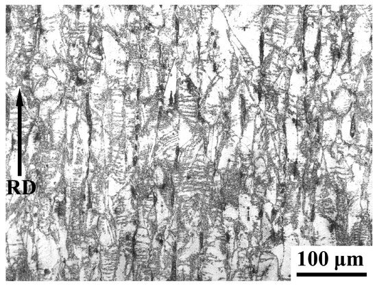 σd was calculated by Equation (6) [45], where M is the Taylor factor of austenite steel (3.06) [44], α is a constant for austenite metal (0.2) [46], and ρ is the dislocation density. The dislocation density ρdis was calculated by Equation (7) [47], where θ is the misorientation angle, and μ is the unite length (0.1 μm). The misorientation angle was estimated based on the KAM map, which gives a dislocation density of ~1.2 × 1015 m−2 in the unrecrystallized austenite region.