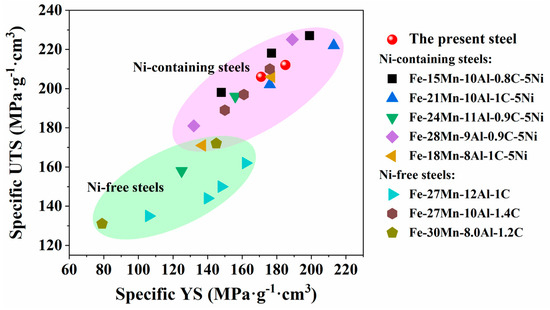 Specific UTS versus specific YS of present steel compared to other Ni-containing [17,19,25,48,49] steels and Ni-free steels [1,9,50].