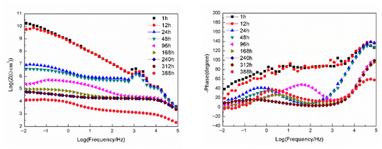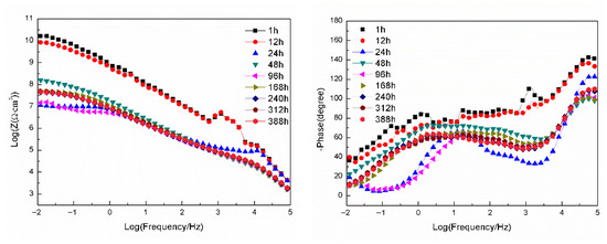 - For the samples with epoxy coatings on the blank 7N01 substrates, 388 h immersion causes decline of the impedance value at 10−2 Hz from 1010 Ω·cm2 to 1.26 × 104 Ω·cm2. While for the 7N01 substrates pretreated by 5% BTESPT doped with 5 × 10−3 M cerium nitrate and 0.5 g/L zeolite particles the impedance value at 10−2 Hz remains above 107 Ω·cm2, more than two to three orders of magnitude higher than the former.