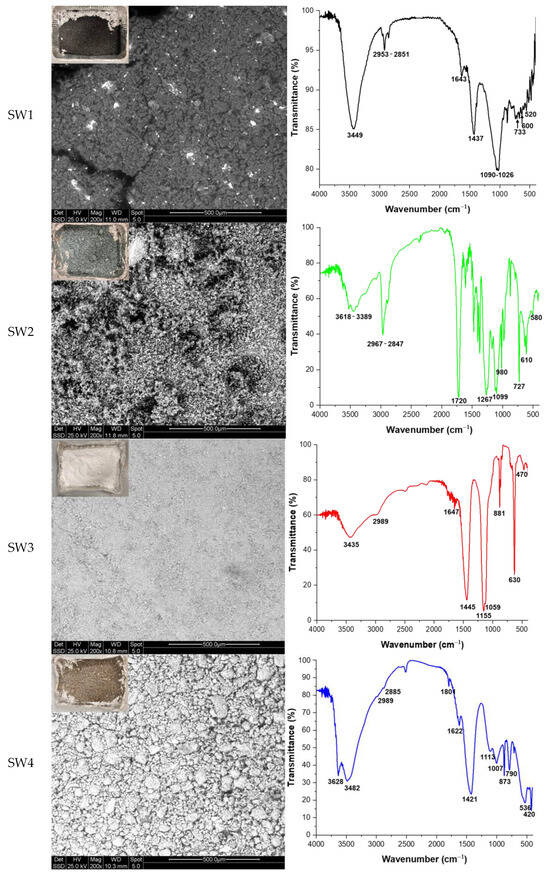 Four different types of industrial waste were provided by an Italian company located in Aversa. These waste materials, along with their main properties and labels, are detailed in Table 1, while their macroscopic and microscopic appearance and complex FT-IR spectra are shown in Figure 1. According to the data reported in Table 1, these wastes are characterized by the presence of heavy metals (As, Sb, Sn, Pb, Fe, Ni, Cr, and Cu—for all SW1–4), as well as chlorides (SW2 and SW3), sulfates (SW3), fluorides (SW3), and hydrocarbons of short and long chains (for all SW1–SW4). The presence of these contaminants disallows their disposal in common landfill, as they need to be treated and made inert before their disposal.