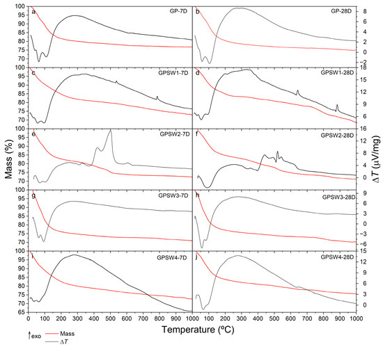 The simultaneous TG-DTA curves of GPs aged for either 7 or 28 days (denoted as 7D and 28D, respectively) are compared in Figure 5 (plots a and b, respectively) with those of the four GPs prepared with four different wastes (GSPW1, GPSW2, GPSW3, and GPSW4) under the same two aging conditions (plots c to j). The temperature ranges and total amounts of differently bound water contained in the materials (expressed as mass percentages) are summarized in Table 4 for comparison purposes.