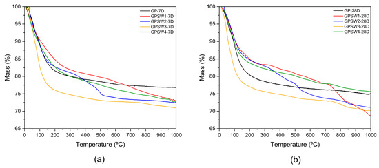 TG curves of the GPX series: (a) 7D vs. (b) 28D obtained using several non-isothermal experiments from RT up to 1000 °C at a heating rate of 10 °C/min under an Ar flow of 40 cm3/min.