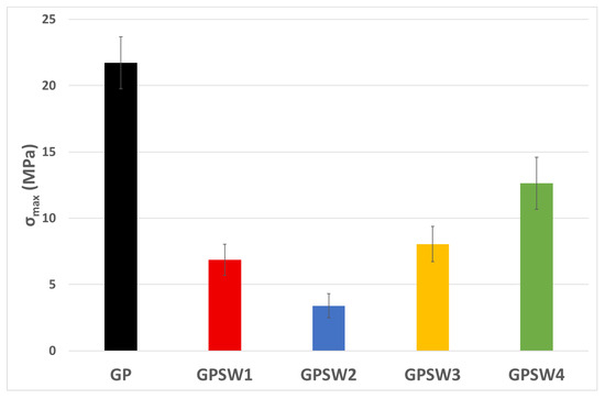 The compressive strength results after 28 days of aging are reported in the histogram in Figure 7. The replacement of MK with industrial wastes led to a decrease in mechanical properties. Indeed, all σmax values for the GPSW(1–4) series were lower than the reference one (22.0 MPa). This reduction in mechanical strength may have been due to the reduction in Al content in the GPSW(1–4), since 20 wt.% of MK was replaced with wastes [63,64,65], while the amount of activation solution was decreased according to the MK content. Specifically, for the GPSW1 sample, the Fe present in SW1 could replace Al, improving the compressive strength. However, the Ca and K present in this waste could also increase the positive ions, which would cause electrostatic repulsions at molecular level, compromising compressive strength [63]. This occurred even in the GPSW2 and GPSW3 samples, which were rich in chlorides and sulfates, even though the former had a high Al and Fe content. The higher compressive strength of GPSW4 with respect to the other waste-containing geopolymers could be related to its better-structured network, as also confirmed by thermal analysis.