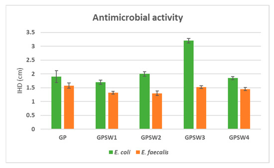 Figure 9 shows the antimicrobial properties of the geopolymer samples. All geopolymer samples had higher antimicrobial activity with respect to E. coli. Since most of the geopolymer samples (except GPSW1) showed no release of heavy metal ions in huge amounts, antimicrobial activity against this Gram-negative bacterium could be attributable to the alkaline environment. Indeed, according to [68], this bacterium undergoes failure in pH homeostasis and starts producing heat-shock protein, as well as inducing SOS, which leads to cell division inhibition. This antimicrobial property was also enhanced in the geopolymer containing SW3 (IHD value equal to 3.2 cm). This may be attributed to the high content of chlorides in this waste. Indeed, an increase in Cl− in the cytosol of this bacterium leads to an increase in oxidative stress, which, in turn, causes cell death [69]. On the other hand, most of the results obtained for the treatment of E. faecalis with the geopolymers showed lower antimicrobial properties. This higher resistance to the alkaline environment is attributable to the fine regulation of homeostasis. Indeed, during this kind of environmental stress, this Gram-positive bacterium can synthesize membrane proteins which finely regulate H+/OH− concentrations and increase its survival [70,71,72].