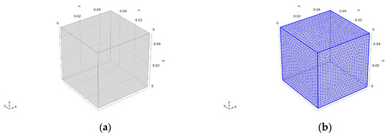 (1) A geometric simulation model of the specimen was established, and the specimen model units were divided. According to the experimental design dimensions, the same model size of 50 mm × 50 mm × 50 mm was determined. As shown in Figure 2. at the same time, in order to obtain the internal temperature field of the specimen, 15 domain point probes were arranged, including the center point of the model (0.025, 0.025, and 0.025), to monitor the internal temperature changes of the specimen during the EIH curing process. To achieve more accurate results, a more refined grid division was used, with a complete grid containing 100,140 domain units, 4692 boundary units, and 216 edge units. The result of the model unit division is shown in Figure 2b.