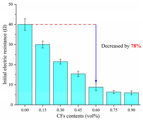 The initial resistance of fresh specimens with different CF contents are shown in Figure 3, and the concept of initial resistance refers to the measured resistance of fresh specimen when it was just cast into the mold. It can be observed from the results that the resistance of the specimens decreased significantly with the increase in CF content. The variation of initial resistance with carbon fiber dosage can be divided into two stages. Without adding CFs, the resistance of the fresh mortar can reach 40 Ω, at which point the specimens mainly rely on the ionic conduction in the pore solution. When the CF dosage increased to 0.6 vol%, the initial resistance of the fresh mortar was 8.8 Ω. As the CF dosage continued to increase, the rate of decrease in resistance was significantly smaller compared to before. Based on the experimental results, it can be concluded that a stable conductive network was formed in the mortar specimens when the CF content was 0.6 vol%. Therefore, it is determined that the percolation threshold of CFs for forming a completely connected conductive path within the fresh cement mortar is 0.6 vol%.