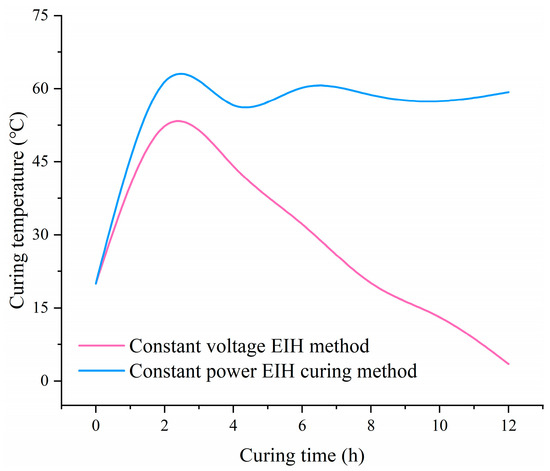 In order to verify the influence laws of different EIH curing regimes on the properties of cement-based materials, two EIH curing regimes were compared: constant-power EIH curing and constant-voltage EIH curing. The curing age was set to be 12 h. The curing temperature of the specimens was measured to verify the effects of these two regimes. The specific design of the EIH curing method is as follows: