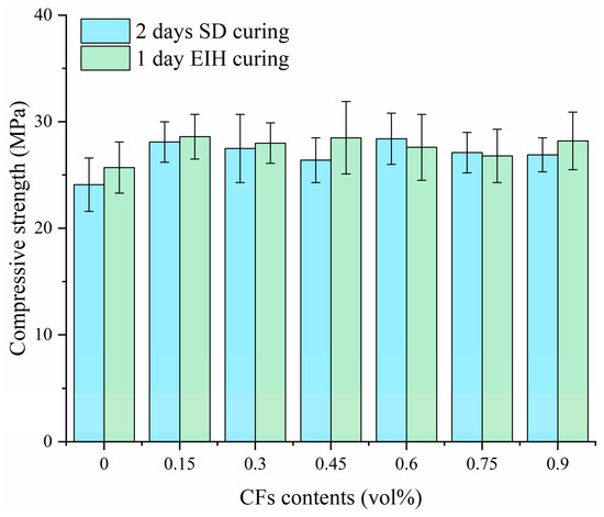 Figure 7 presents the early-age compressive strength development of CF-CM specimens cured by different curing methods. The results demonstrated that the 1-day EIH curing method achieved compressive strengths comparable to the longer SD curing method under challenging sub-zero condition of −20 °C, highlighting the feasibility of EIH curing for early strength development in cold climates; this equivalence was significant given the harsh −20 °C environment, where conventional hydration processes were severely inhibited. The effectiveness of the short-duration EIH treatment suggested that the applied internal heat during the initial 24 h effectively promoted the strength formation for the specimens to overcome the detrimental effects of low temperature. It can be found that no matter the CF contents inside the specimen, the compressive strengths of EIH specimens were all above 25 MPa. It should be noted that traditional cement concrete failed to gain strength under −20 °C, so the implementation of EIH curing was significant for the winter concrete construction. Moreover, the incorporation of CFs enhanced the compressive strength of the specimen compared to the unreinforced control (0 vol% CFs), which was attributed to the fibers’ role in microcrack bridging, stress distribution, and providing secondary reinforcement. However, the analysis further indicated that increasing the CF content showed little influence on compressive strength. To be specific, the compressive strengths of EIH-cured specimens with varying CF contents were 25.7 MPa, 28.6 MPa, 28.0 MPa, 28.5 MPa, 27.6 MPa, 26.8 MPa, and 28.2 MPa, with the CF contents varying from 0 vol% to 0.9 vol%.