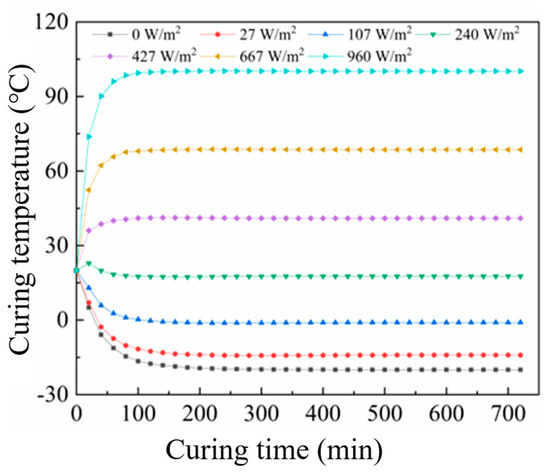 Figure 8 reveals that the stabilized temperature at the center of the specimen increased progressively with higher curing power density. At 0 W/m2 (i.e., no electrical input in a −20 °C environment), the center temperature decreased rapidly, falling below −10 °C within 60 min and ultimately equilibrating to the ambient temperature of −20 °C. A power density of 107 W/m2 yielded a stabilized center temperature near 0 °C. At 240 W/m2, the heat generated by EIH curing balanced the heat loss to the sub-zero environment, stabilizing the center temperature near the initial 20 °C. A power density of 667 W/m2 achieved a stabilized center temperature of approximately 65 °C, providing suitable conditions for cement hydration in sub-zero environments and enabling rapid strength development. However, a further increase in the power density to 960 W/m2 elevated the stabilized temperature to 100 °C. This excessive temperature may induce detrimental thermal stresses that compromise strength.