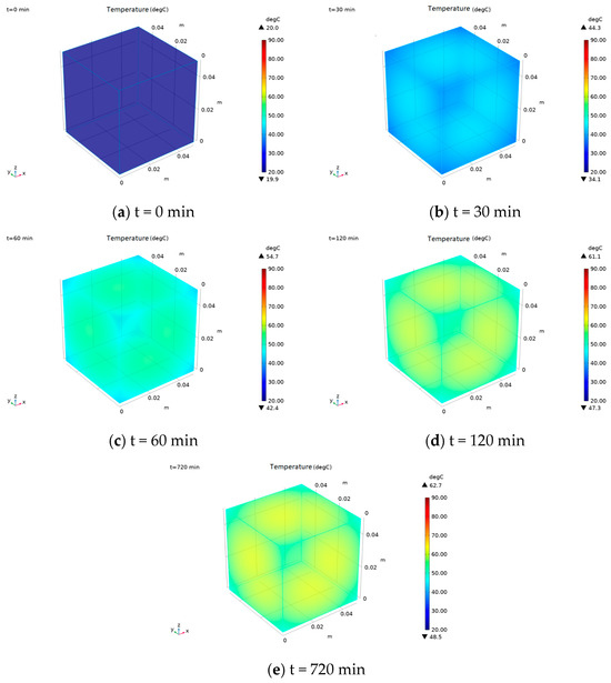 Since the center point temperature alone cannot fully characterize the curing temperature distribution of EIH-cured specimens, the temperature field during EIH curing was investigated. In this part, the constant optimal power density (667 W/m2) was determined, and the surface temperature distribution of mortar specimens in a −20 °C environment was simulated at various curing times (Figure 10). The results showed a slightly elevated temperature at the surface center, decreasing radially towards the edges. The four corners exhibited the lowest surface temperatures due to their maximum interfacial area with the environment. To be specific, the bigger interfacial area of the specimen between environment can facilitate greater heat dissipation, which can influence the curing temperature distribution of EIH-cured specimens. Moreover, during the first 60 min of EIH curing, the overall surface temperature increased continuously. However, the corner regions warmed slower than the central areas, and this temperature differential widened with prolonged curing. Beyond 120 min, the temperature stabilized uniformly across most of the specimen surface.
