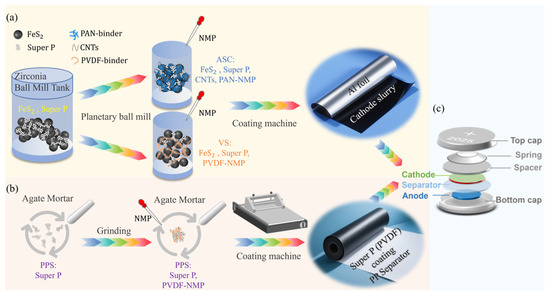 Composite cathodes were prepared via a solvent-based slurry coating method. In the experimental group, FeS2 nanoparticles (90 wt.%,< 50 nm, Guangdong Yunfu Warner New Energy Co., Ltd.), PAN (molecular weight 85,000, Aladdin), and a mixture of Super P conductive carbon and CNTs (mass ratio 1:1, Super P is analytical grade, Aladdin; CNT purity > 95%, diameter 10–20 nm, Timesnano) were used as the active material, binder, and conductive agent, respectively, with an overall mass ratio of 8:1:1. As shown in Figure 1a, the specific steps were as follows: First, 8 g of commercial FeS2 was mixed with 0.5 g of Super P, sealed in a zirconia ball mill jar, and dry-milled for 2 h using a planetary ball mill. Subsequently, 12.5 g of CNT slurry (total solid content = 4 wt.%) and 24 mL of PAN-NMP binder (prepared by adding 0.6 g of PAN to 24 mL of NMP and stirring for 12 h; total solid content = 2.5 wt.%) were added, and the mixture was sealed in a ball mill jar and ball-milled for 12 h. The prepared slurry was coated onto aluminum foil using a 100 μm doctor blade. After coating, the carbon-coated aluminum foil was transferred to a blast drying oven at 60 °C for 2 h, then vacuum-dried at 80 °C for 12 h. The prepared cathode was cut into circular discs with a diameter of 10 mm, denoted as the ASC cathode.