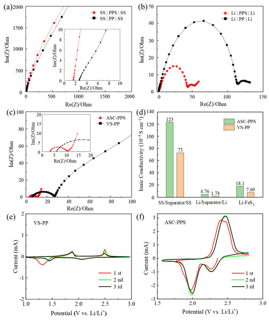 Nyquist plots of (a) SS|separator|SS, (b) Li|separator|Li, and (c) full cells; (d) comparison of ionic conductivities; CV curves of (e) VS-PP and (f) ASC-PPS.