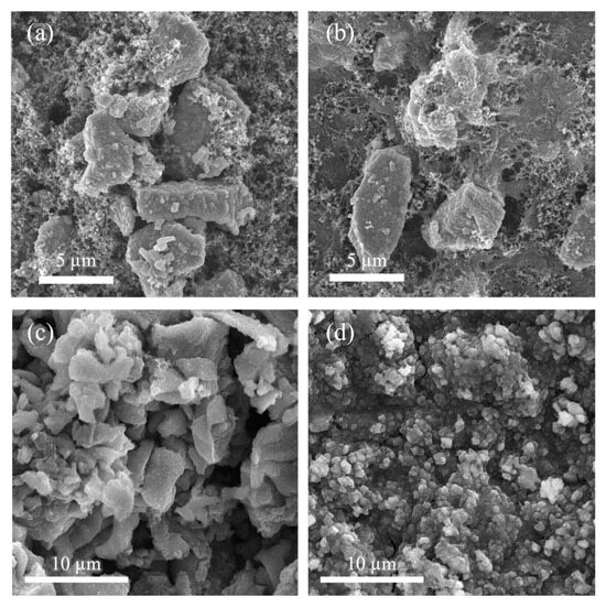 The electronic conductivity of the cathode films was measured using a DC four-probe tester (RTS-5, Shidai Zhifeng, Beijing, China) at room temperature. The cathode films were cut into rectangular strips (10 mm × 40 mm) and pressed onto a clean glass slide. Four probes were uniformly placed on the film surface with a spacing of 5 mm, and a constant current was applied to measure the voltage drop. The conductivity (σ) was calculated using the formula σ = L/(R × S), where L is the distance between the inner two probes (cm), R is the measured resistance (Ω), and S is the cross-sectional area of the film (cm2, calculated as thickness × width).