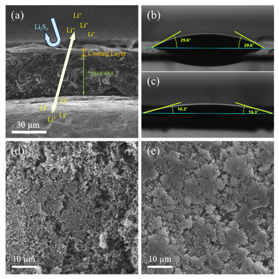 The PPS separator’s coating (8 μm thickness, Figure 5a) exhibited a hydrophilic contact angle of 16.3° (Figure 5c), a 45% reduction from the unmodified separator (29.6°, Figure 5b), enhancing electrolyte wettability. We optimized the Super P content to 8 wt% to balance ionic conductivity and polysulfide retention: excessive carbon (>10 wt%) blocks ion channels (as observed in EIS with increased resistance), while insufficient carbon (<5 wt%) reduces adsorption capacity [41]. The initial surface morphology of PPS (Figure. 5d) showed a sparse porous network with a uniform coating, except for minor carbon agglomeration on the sides, providing critical structures for polysulfide adsorption.