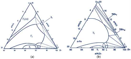 The use of Ti additives in the zinc bath has also been aimed at limiting the growth of the zinc coating over time, so that zinc waste in the process is reduced, and the obtained coatings can be thinner. The problem of intensive zinc coating growth mainly affects alloys containing silicon and phosphorus [26,27]. Sandelin steels, where the Si content is in the <0.1% Si range, are particularly sensitive to these elements [28]. To reduce coating growth for steels in the Sandelin range, a solution was developed by adding Ni to the zinc bath. This addition has a negligible effect in forming coatings on high-silicon steels [29]. Zinc coatings with Ni obtained on Sandelin steel have a similar structure to the coating obtained on low-silicon steel [5]. An Ni content above 0.06% in the zinc bath significantly changes the equilibrium in the Fe-Zn-Ni system. The delta phase in such a variation of the process can crystallize directly from the liquid already at 450 °C [30]. In the structure of such a coating, a mixture region of δ and η phases can be distinguished. Separations of the ζ phase are formed as loose crystals at the boundary of the δ phase, without forming a continuous layer [31]. A zinc bath with Ti added, prepared for testing, can produce similar effects as the bath with Ni added, but limits the growth of the coating over the entire range of Si content. Analysis of the Fe-Zn-Ti and Fe-Zn-Ni triple systems, which show great similarity, leads to such conclusions. The systems are presented in Figure 3.