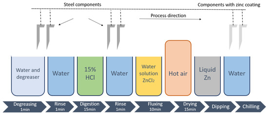 The shaping of zinc coatings, and consequently their properties, are affected by all the parameters of the process conducted. Researchers aim to optimize the process in all respects, such as by maximizing the resistance of coatings while reducing the cost of the process [5,6,7,8,9,10]. Numerical methods also find application in process optimization [11,12,13,14]. In order to reduce the thickness of the zinc coating, multi-component baths with synergistic effects are used [15,16,17,18].