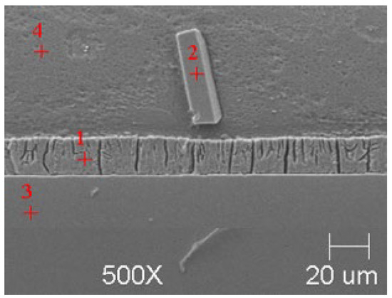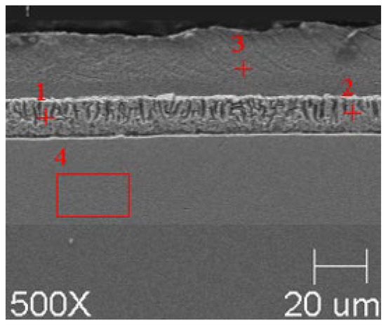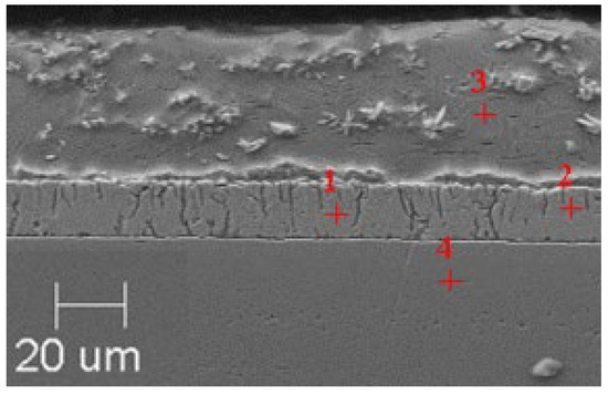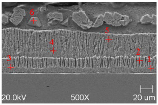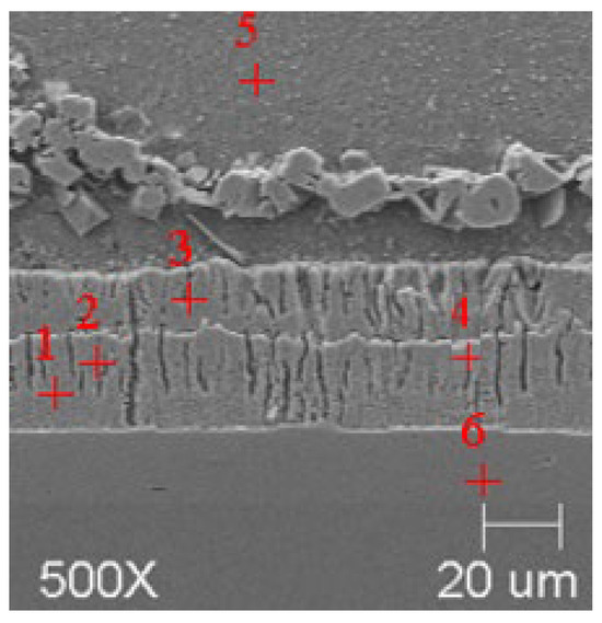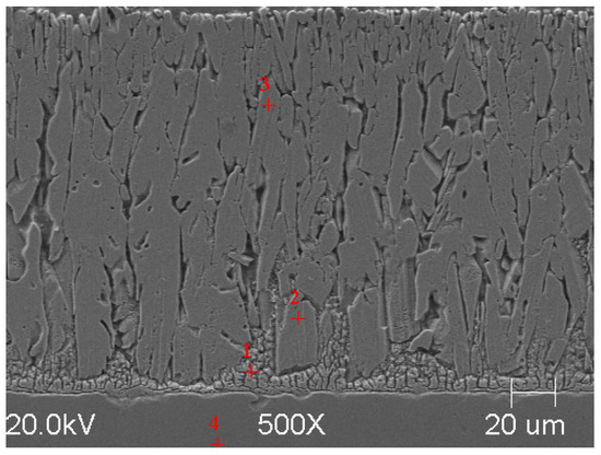 SEM microanalyses were performed using a JEOL 500LV microscope (JEOL Ltd., Akishima, Japan). This made it possible to capture the microstructures of the coatings obtained in the experiment more accurately. The morphology of the resulting phases was analyzed using SEM imaging, and the chemical composition was determined using an X-ray microanalysis attachment with an EDS detector. Results of the analysis are shown in Figure 5, Figure 6, Figure 7, Figure 8, Figure 9 and Figure 10 and Table 4, Table 5, Table 6, Table 7, Table 8 and Table 9.