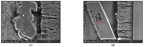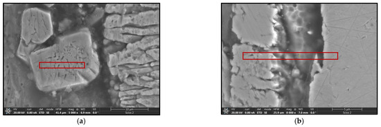 The use of a Tecnai G2 F20 transmission electron microscope enabled the identification, with high probability, of the phases present in the material. This analysis requires the preparation of sufficiently thin samples, the performance of which in the case of heterogeneous materials poses many difficulties. The thin foils for testing were prepared using the focused ion beam (FIB) technique on a Thermo Fisher Scientific SCIOS 2 Dual-Beam microscope due to its high accuracy and precision in cutting. Figure 12 shows the locations from which thin foils were collected for TEM observation, marked with red rectangles.