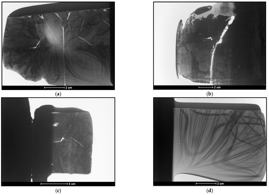 The thin foils taken for testing were 100 nm thick and approximately 10 μm × 10 μm in size. The finished preparations are shown in Figure 13. Due to the different phase composition within the sampled films, the obtained preparations were cracked.