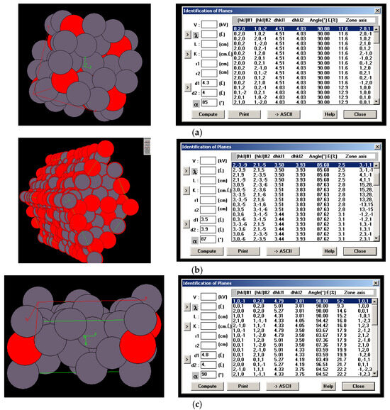 The samples prepared in this way were subjected to TEM studies structure characterization. The result of this action can be obtained by SADP. The image of the diffraction grating was analyzed, the parameters of the lattice were determined, and the particle with the best representation was matched. The particle models of the elementary phases present in the zinc coating are shown in Figure 14.