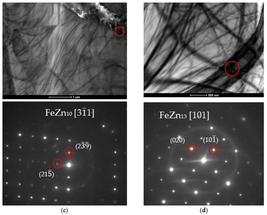 Bright field (BF) TEM images with phase analysis performed using SADP confirming the presence (a) FeZn13; (b) Fe3Zn10; (c) FeZn10; (d) FeZn13 phases.