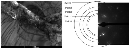 The particle models should be confronted with the diffraction grids of the tested materials to determine the fit of the results to the models. The microstructure characterization of zinc coatings along with the phase analysis using SADP are presented in Figure 15 and Figure 16.