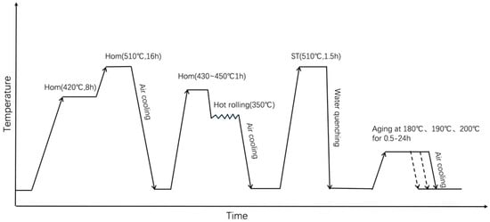 These specimens were solid-solution treated at 510 °C for 1.5 h, subsequently water quenched, and then immediately aged at 190 °C for 3 h. The heat treatment procedure has been shown in Figure 1. Mechanical properties at room and elevated temperatures were determined using an AG-Xplus electronic universal testing machine (Shimadzu, Kyoto, Japan) following the GBT 228.1-2010 standard [27] at a tensile velocity of 2 mm/min. Three specimens per heat treatment condition were tested, and the results were averaged.