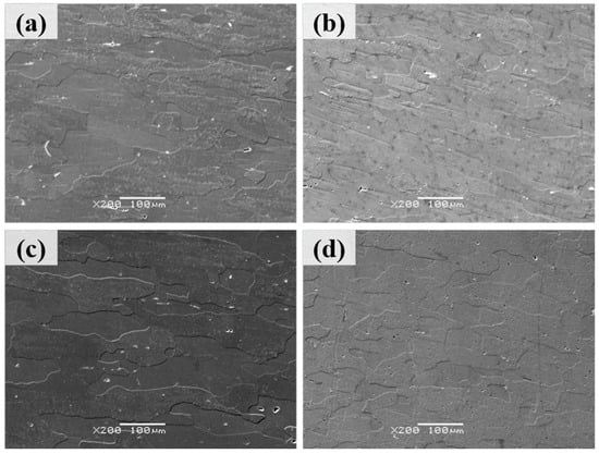 Figure 4 presents the backscattered electron (BSE) micrographs of Al–4.0Cu–0.5Mg–0.5Zn–0.5Mn–0.4Ag–(x = 0, 0.08, 0.16, and 0.24)Zr (in wt.%) alloys after solution treatment at 510 °C/1.5 h. It can be observed that the three Zr–containing alloys partially retained their elongated grain structure from hot rolling. In contrast, the Al–4.0Cu–0.5Mg–0.5Zn–0.5Mn–0.4Ag alloy (without Zr) exhibited more pronounced grain growth after the 510 °C/1.5 h heat treatment. These results can once again demonstrate that the addition of zirconium (Zr) enhances the recrystallization resistance of the alloy.