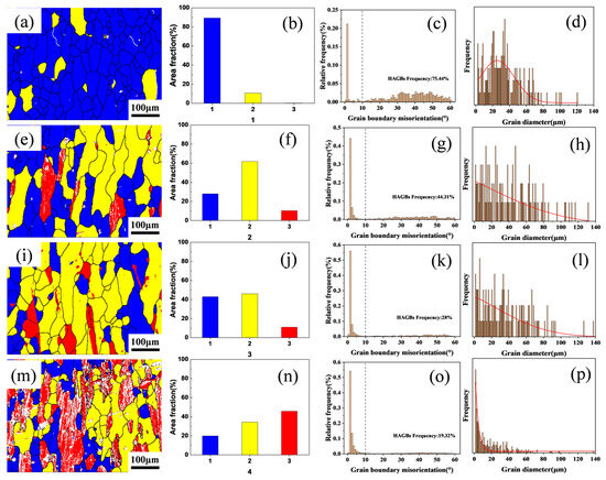 As evidenced in Figure 5a,e,l,m, variations in Zr content exert a significant influence on grain size and morphology. The Al–4.0Cu–0.5Mg–0.5Zn–0.5Mn–0.4Ag alloy exhibits extensive recrystallized regions, demonstrating a recrystallization fraction of 89.29% and a high-angle boundary (HAB) proportion of 75.44%, indicating predominantly equiaxed recrystallized grains, as shown in Figure 5b,f,j,n. In the Al–4.0Cu–0.5Mg–0.5Zn–0.5Mn–0.4Ag–0.08Zr alloy, recrystallized areas decrease while sub-grain and deformed grain fractions increase, accompanied by a reduced HAB frequency of 44.31%. This composition features elongated grains with markedly diminished equiaxed recrystallized structures. Al–4.0Cu–0.5Mg–0.5Zn–0.5Mn–0.4Ag–0.16Zr alloy shows a recrystallization fraction of 27.95%, containing distinctly elongated grains aligned with the rolling direction and exhibiting relatively uniform grain size. With further Zr addition, the Al–4.0Cu–0.5Mg–0.5Zn–0.5Mn–0.4Ag–0.24Zr alloy registers a recrystallization fraction of 19.91% and sub-grain fraction of 34.32%, retaining substantial deformed grains. These red-colored deformed grains contain abundant Low-Angle Boundaries (LABs), display significant grain size heterogeneity, and exhibit a markedly reduced HAB proportion of only 19.32%. Complementary quantitative analyses of HAB/LAB distributions and grain diameter statistics across Al–4.0Cu–0.5Mg–0.5Zn–0.5Mn–0.4Ag–xZr (in wt.%) alloys are presented in Figure 5c,g,k,o and Figure 5d,h,l,p, respectively.