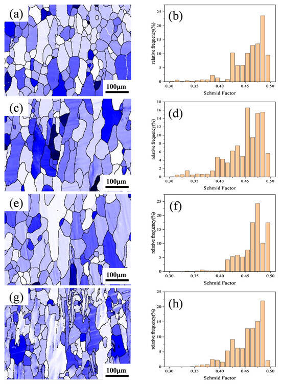 As observed in Figure 6, newly recrystallized grains typically exhibit higher Schmid factor values compared to deformed structures, meaning that they deform more readily. A comparison of Figure 6e–h reveals that the Al–4.0Cu–0.5Mg–0.5Zn–0.5Mn–0.4Ag alloy contains a small number of sub-grain regions (black) with relatively low Schmid factor values, but the Al–4.0Cu–0.5Mg–0.5Zn–0.5Mn–0.4Ag–0.08Zr alloy retains some deformed structures (dark blue). In the Al–4.0Cu–0.5Mg–0.4Ag–0.16Zr alloy, the overall color becomes lighter. The deformed structures within it still maintain lower Schmid factor values, resulting in a smaller overall difference in Schmid factor values. In the Al–4.0Cu–0.5Mg–0.5Zn–0.5Mn–0.4Ag–0.24Zr alloy, a significant number of deformed structures appear pale–colored, almost all exhibiting higher Schmid factor levels. Coarse deformed grains remain prevalent. Conversely, the recrystallized grains and sub-grain structures within this alloy possess lower Schmid factor values. Stress concentration tends to occur near the coarse deformed grains with higher Schmid factors. Consequently, dislocations continuously accumulate in these regions, leading to the initiation of intergranular cracks and thereby impairing the alloy’s performance.