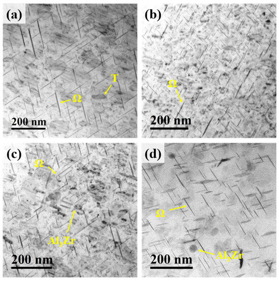 Figure 7 shows the TEM images of the peak-aged Al–4.0Cu–0.5Mg–0.5Zn–0.5Mn–0.4Ag–(x = 0, 0.08, 0.16, and 0.24)Zr (in wt.%) alloys. A high density of needle-/plate-like precipitates and a small number of rod-shaped precipitates are distributed within the matrix of all alloys. Additionally, spherical precipitates are observed in the Al–4.0Cu–0.5Mg–0.5Zn–0.5Mn–0.4Ag–0.16Zr and Al–4.0Cu–0.5Mg–0.5Zn–0.5Mn–0.4Ag–0.24Zr alloys. After the two–step homogenization treatment, the Al3Zr phase becomes finer, more uniformly distributed, and more dispersed. Moreover, the spherical precipitates in the former condition are found to be more numerous and smaller in size compared with the latter [28]. The needle-/plate-like precipitates are identified as the Ω-phase, the rod-shaped precipitates as the θ’-phase, and the spherical precipitates as the Al3Zr phase. No S-phase precipitates were detected in these alloys, or their content is extremely low. This indicates that reducing the Mg content effectively suppresses the precipitation of the S-phase.