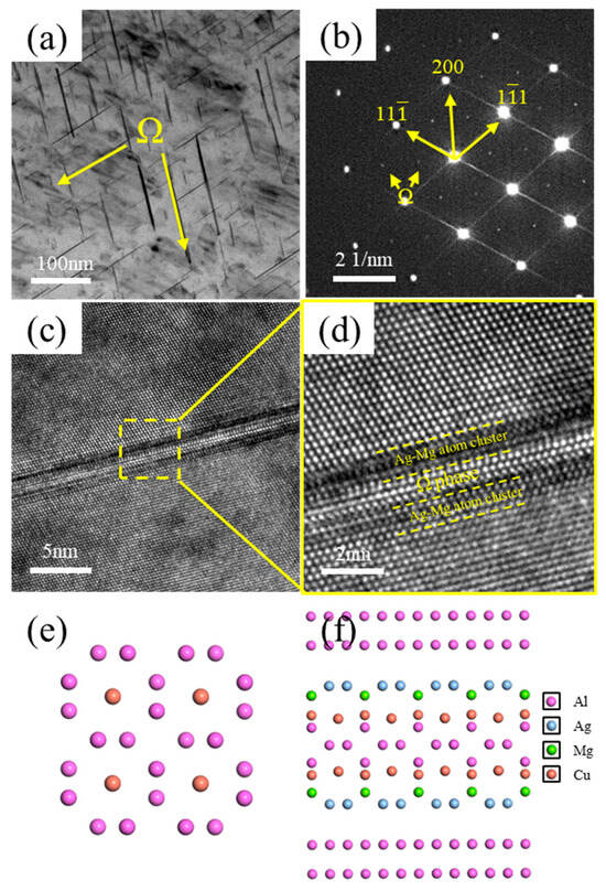 Figure 8 presents TEM images of the Ω-phase in the alloy. As shown in Figure 8a, the Ω-phase exhibits a plate-like morphology and is distributed within the alloy matrix. Its corresponding diffraction pattern is shown in Figure 8b. Figure 8c shows a high-resolution TEM (HRTEM) image of the Ω-phase, and Figure 8d displays its corresponding Fast Fourier Transform (FFT) pattern. The interfacial structure between the Ω-phase, the Ag–Mg bilayer, and the Al matrix is depicted in Figure 8f, while the structure of the Ω-phase itself is illustrated in Figure 8e. It can be observed that distinct Ag–Mg bilayers flank both sides of the Ω-phase, effectively sandwiching it. Due to the blocking effect of the Ag–Mg bilayer on the diffusion of Cu atoms from the Al matrix into the Ω-phase, the thickening resistance of the Ω-phase is significantly increased. Consequently, the Ω-phase exhibits enhanced thermal stability. The entire Ω-phase plate maintains an almost uniform thickness. While the length of the Ω-phase is prone to increase, its thickening is hindered. Therefore, after formation, the Ω-phase grows laterally along its primary growth direction.