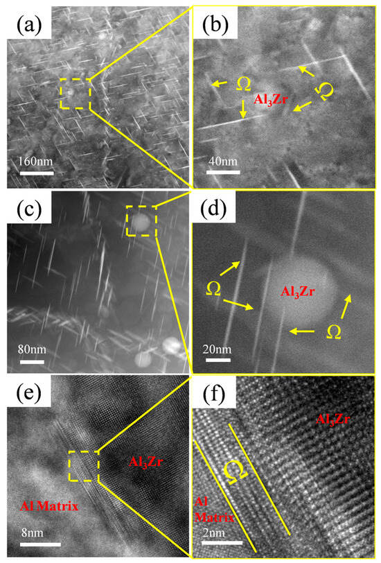 During the study of precipitates, it was observed that the Ω-phase in the alloy tends to form adjacent to or in the vicinity of Al3Zr particles, as shown in Figure 10. Figure 10a,c reveal a high density of needle-like Ω-phase precipitates distributed near the Al3Zr particles in the alloy, with most of them in contact with the Al3Zr phase. Figure 10b,d shows magnified views of the boxed regions. Figure 10e displays the morphology of a small, incipient Ω-phase precipitate nucleating on an Al3Zr particle, and Figure 10f provides a magnified view of the boxed area in Figure 10e, clearly showing the narrow, nascent Ω-phase attached to the Al3Zr particle. Therefore, it can be inferred that, during Ω-phase formation, the pre-existing Al3Zr particles or the strain fields surrounding them can act as heterogeneous nucleation sites for the Ω-phase. This promotes heterogeneous nucleation of the Ω-phase, thereby increasing its nucleation rate and refining the Ω-phase precipitates in the alloy.