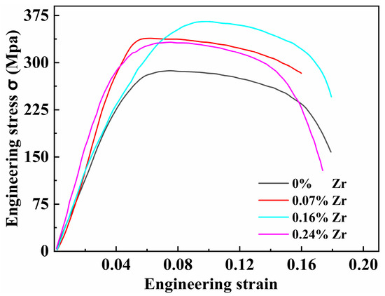 To investigate the effect of Zr content on high-temperature performance, tensile tests were conducted at 200 °C on all four peak-aged alloys. The results are presented in Figure 11 and Table 3. Compared to room temperature tensile properties, the mechanical properties of the Al–4.0Cu–0.5Mg–0.5Zn–0.5Mn–0.4Ag–(x = 0, 0.08, 0.16, and 0.24)Zr alloys at 200 °C show significant changes. The Al–4.0Cu–0.5Mg–0.5Zn–0.5Mn–0.4Ag alloy (x = 0) still maintains the highest elongation to failure. With increasing Zr content, the high-temperature yield strength gradually increases. The trend in high-temperature tensile strength resembles that observed at room temperature, with the Al–4.0Cu–0.5Mg–0.5Zn–0.5Mn–0.4Ag–0.16Zr alloy exhibiting the highest tensile strength.