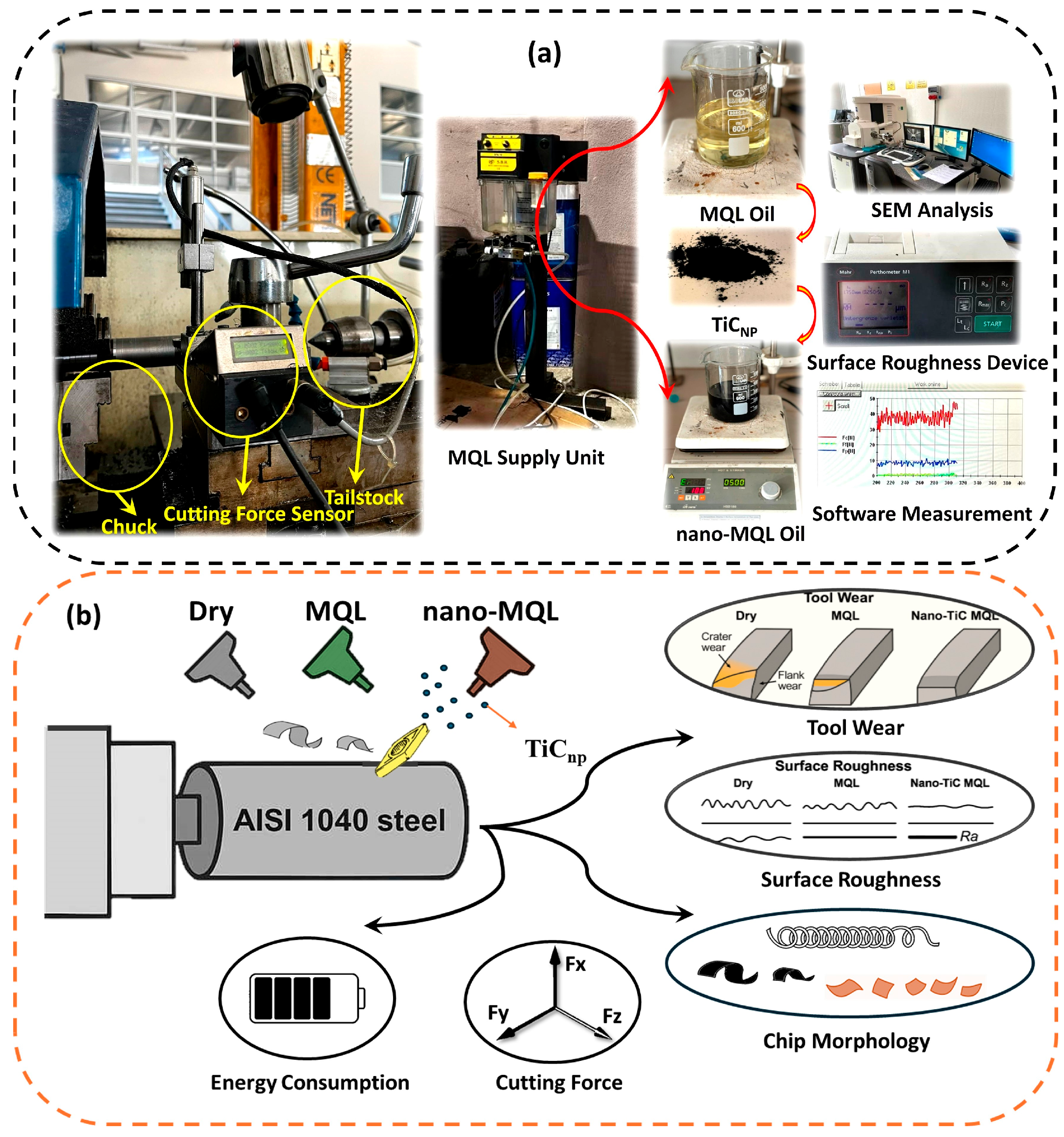 Considering the available literature and the authors’ present level of knowledge, the use of TiC-based nano-MQL lubrication in turning operations, especially for 1040 steel, has not been previously reported in the literature. TiC possesses high hardness, excellent thermal conductivity, and outstanding tribological characteristics, making it a promising candidate for improving the efficiency of cutting fluid applications [41]. The integration of TiC nanoparticles into an MQL technique shows promise in achieving additional reductions in tool wear, thermal load, and energy usage, while improving surface roughness and chip morphology. However, its application in the turning of AISI 1040 steel remains unexplored. Thus, this research addresses a specific and previously unexplored area by introducing a TiC-enhanced nano-MQL lubrication technique during the turning of AISI 1040 steel.