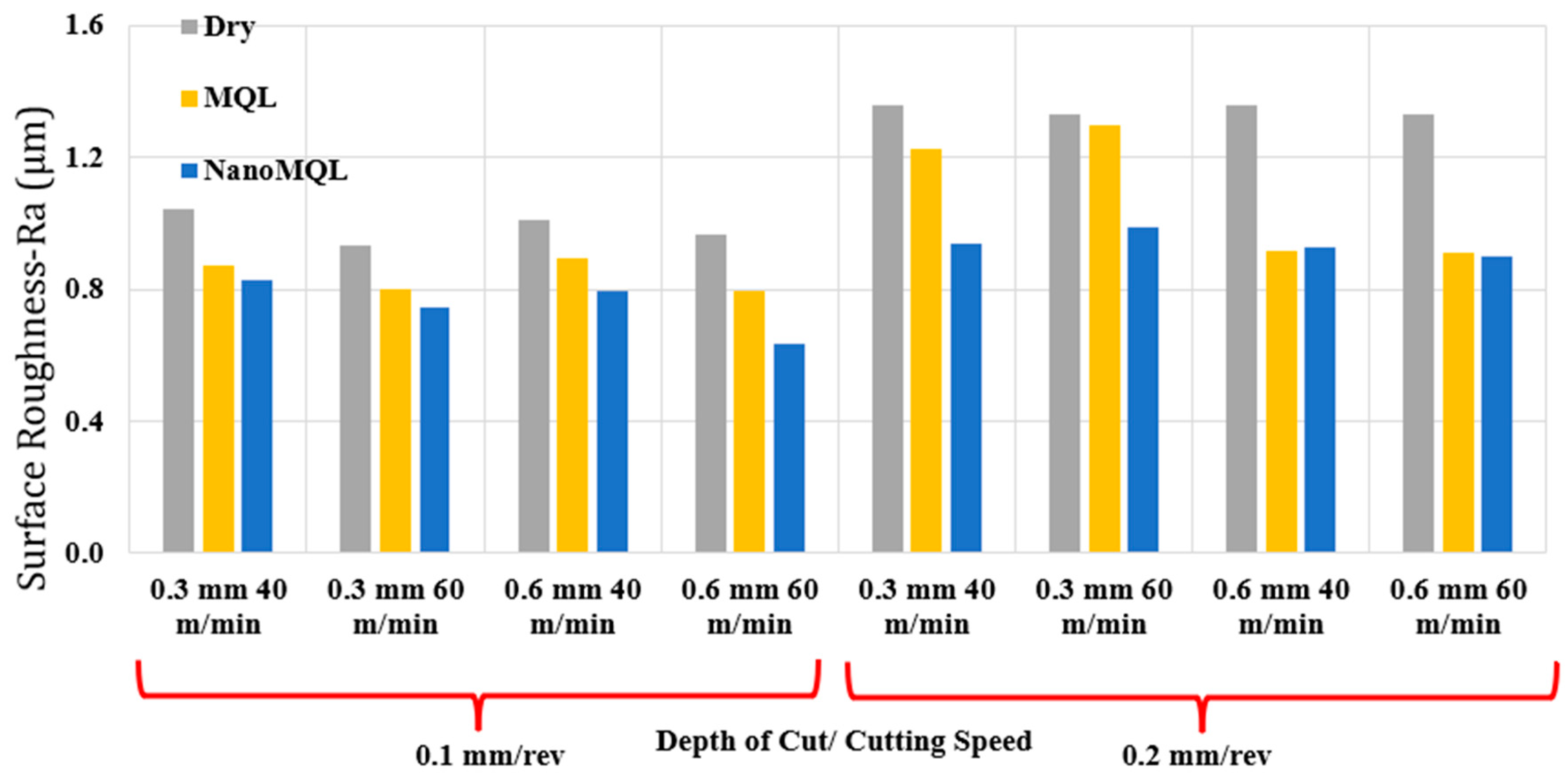 Among the various parameters, surface roughness is the primary output parameter in machinability evaluations, serving as a key indicator of surface integrity [45,46,47]. Optimizing surface roughness requires the appropriate selection of machining parameters, as it is affected by different factors, including the tool, the mechanical properties of the workpiece material, and the vibrations generated during the cutting operations [48,49,50,51]. Figure 3 demonstrates the graphical representation of roughness the measurements during the experimental trials conducted in this study. The optimum surface roughness was achieved under the conditions of a feed rate of 0.1 mm/rev, a cutting speed of 60 m/min, a depth of cut of 0.6 mm, and under a nano-MQL environment. Conversely, the poorest surface quality was recorded at a feed rate of 0.2 mm/rev, a cutting speed of 40 m/min, a depth of cut of 0.3 mm, and under dry cutting conditions. When comparing different lubrication environments, dry cutting consistently resulted in the highest surface roughness across all parameter combinations, while nano-MQL yielded the lowest values. These findings indicate the necessity of using a cutting fluid to achieve optimal surface finishes. The superior performance of nano-MQL in reducing surface roughness is attributed to its enhanced lubrication, effective heat dissipation, and the cushioning effect introduced by nanoparticles, which collectively reduce friction and fluctuations in cutting forces [38]. Similar findings are reported in [44,52]. When the graph is further analyzed, an increase in feed values is found to cause a corresponding increase in surface roughness values. This observation is consistent with findings in the literature [53,54,55]. Higher feed rates result in greater chip removal rates, which adversely impact the surface quality and increase roughness levels [56]. A noticeable decrease in surface roughness was observed with higher cutting speeds. The observed trend results from the thermal conditions at increased speeds, which facilitate the plastic deformation process in the workpiece [57]. However, under the specific conditions of a 0.2 mm/rev feed rate, a 0.3 mm depth of cut, and both MQL and nano-MQL environments, a rougher surface was obtained at higher cutting speeds. This observation is consistent with [58,59] and can be explained by micro-fractures at the tool tip and accelerated tool wear at higher speeds [60,61]. Varying cutting depths did not result in significant irregularities in surface roughness, suggesting that this parameter has a relatively minor influence compared to the feed rate and cutting speed [62]. Finally, the relative increase in surface roughness under dry cutting conditions was calculated as 45.60%, compared to 62.62% under MQL and 55.93% under nano-MQL.