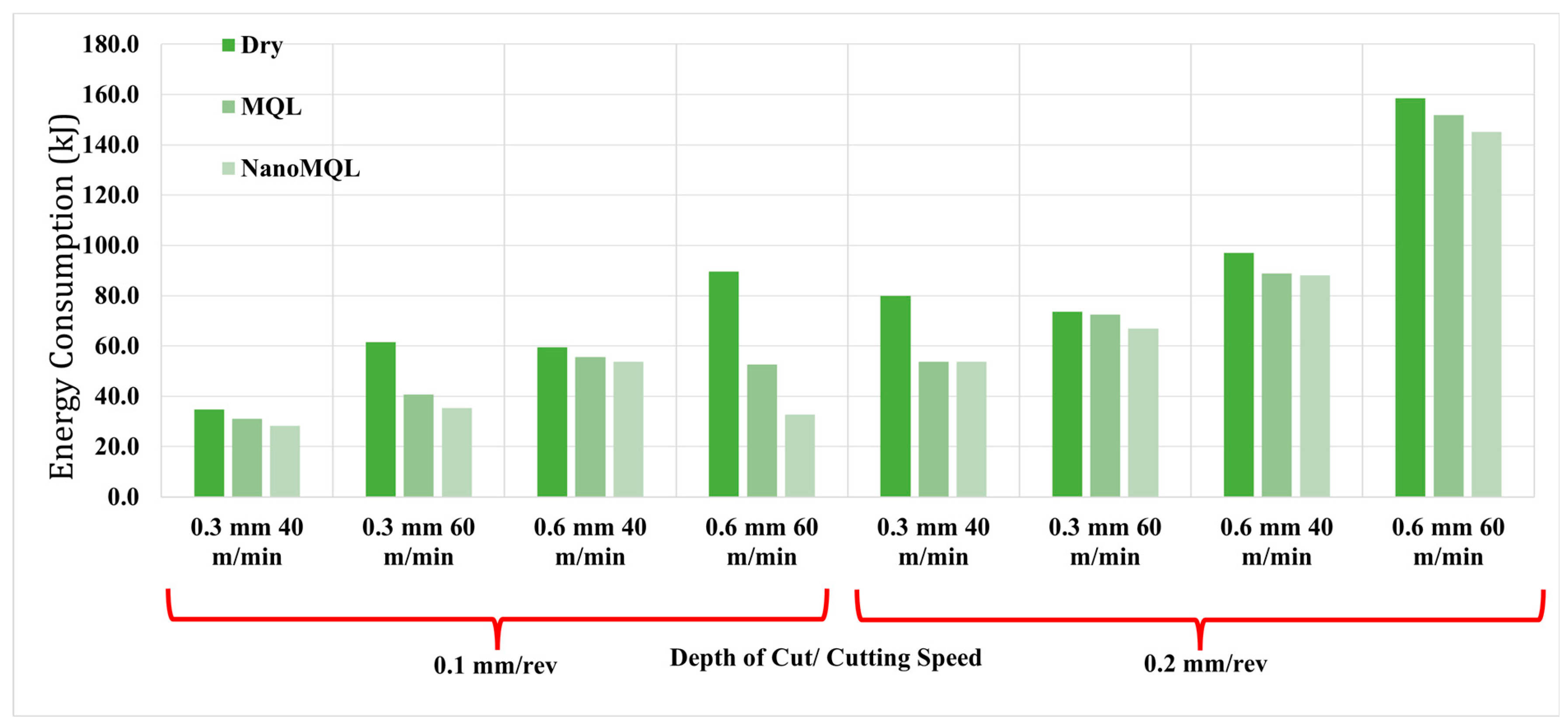 With regard to energy consumption, nano-MQL performed better than the two other methods. This nanoparticle-enhanced lubrication improved chip segmentation and heat conduction, which in turn reduced cutting resistance and the power required for machining. Dry cutting consumed the greatest amount of energy overall due to higher cutting resistance and ineffective chip evacuation.