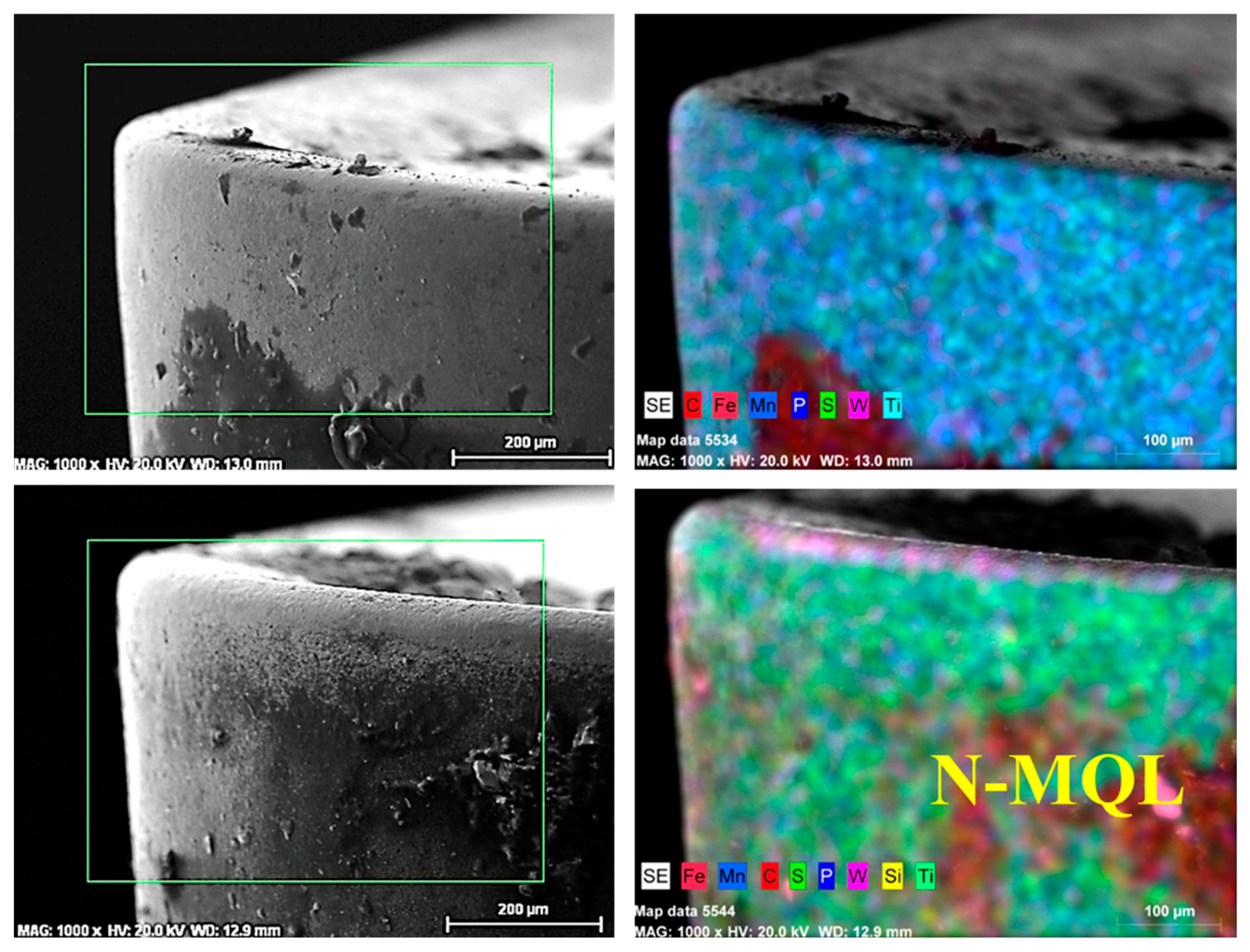 The SEM observations indicated distinct differences in the wear modes depending on the lubricated conditions. In dry machining, the worn features of the cutting inserts included abrasive marks, chipping, and adhesive material on the rake face. These defects indicated that insufficient lubrication resulted in higher friction and thermal loads, which facilitated both abrasive and adhesive wear [83]. Tool edges also exhibited microfractures and BUE due to high stress and high temperature conditions of hard alloy under dry cutting. The use and composition of the cutting fluid were found to influence BUE formation. In comparison, the inserts tested under MQL conditions showed relatively smoother wear areas. Although some abrasive wear marks and material adhesion on the edge were still observed, the degree of wear was visually lower than in dry cutting. The lubricating MQL system may have formed a friction-reducing film between the tool and the chips; consequently, thermal and mechanical stresses could have been relieved, due to the properties of the thin oil film. The rake and flank faces exhibited reduced wear, and the tribological properties were improved.