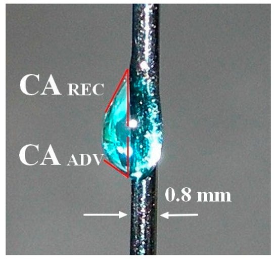- Emelyanenko, A.; Ermolenko, N.; Boinovich, L. Contact Angle and Wetting Hysteresis Measurements by Digital Image Processing of the Drop on a Vertical Filament. Colloids Surf. A Physicochem. Eng. Asp. 2004, 239, 25–31. [Google Scholar] [CrossRef]