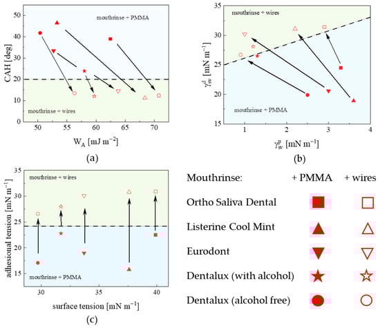 (a) Contact angle hysteresis (CAH) plotted versus work of adhesion (WA); (b) dispersive versus polar terms as a function of total ; (c) adhesional tension versus surface tension for the studied mouthrinses (at original concentrations) deposited on polymeric (PMMA) and metallic substrata at T = 22 °C. The border (dotted) line between data regions corresponds to these two interfacial systems. The selected parameter substratum-specific evolution, for the particular mouthrinse, is indicated with an arrow.