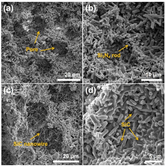 The morphology of the samples is shown in Figure 1. The results show that the pore diameter of the porous Si3N4 ceramic is approximately 17 μm, and it is composed of rod-like structures, with a porosity of 64.3%. Figure 1c shows that in the Si3N4 ceramic pores with a higher content of iron impurities, PCS transforms into SiC nanowires after pyrolysis and heat treatment. Under the action of the metal catalyst, SiO and CO gases generated by the pyrolysis of PCS are dissolved in metal droplets to form SiC nanocrystals and grow in the direction that is conducive to thermodynamics, and then gradually form SiC nanowires [33]. In contrast, PCS did not transform into SiC nanowires in Si3N4 ceramics prepared from higher-purity B-type Si3N4 powder but instead distributed as SiC layers on the pore walls. SiC phases with different morphologies and structures were grown in Si3N4 ceramics obtained from different types of Si3N4 powders under the same processing conditions. Subsequently, by comparing the dielectric properties of SiCnw/Si3N4 and SiC/Si3N4, it will be more conducive to revealing the high-temperature wave absorption mechanism of SiC nanowires.