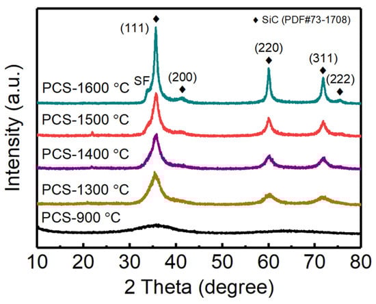 Figure 2 presents the XRD patterns of PCS at different heat treatment temperatures from 900 °C to 1600 °C in an Ar atmosphere for 2 h. The sample pyrolyzed at 900 °C shows weak peak intensity and broad peak width, suggesting low crystallinity. After heat treatment at 1300~1600 °C, distinct diffraction peaks appeared at 35.7°, 41.5°, 60.1°, 72.0° and 75.7° corresponding to the (111), (200), (220), (311), and (222) planes of 3C-SiC (F-43m) with a cubic crystal structure (PDF#73-1708), respectively. The intensity of the diffraction peaks increases with the rise of the heat treatment temperature, indicating that the crystallinity of SiC has improved. Based on the Scheeler formula, the average crystal size of SiC at 1300 °C, 1400 °C, 1500 °C, and 1600 °C was calculated to be 5.0 nm, 6.8 nm, 7.7 nm, and 13.3 nm, respectively, meaning that the average crystal size increases correspondingly with the increase in temperature. Therefore, the SiC phase in SiC/Si3N4 ceramics is mainly composed of amorphous and nanocrystalline states.