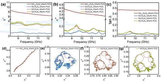(a) The , (b) , (c) dielectric loss tangent (, and (d–g) Cole–Cole plots of SiCnw/Si3N4 and SiC/Si3N4.