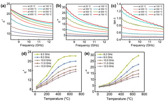 The complex permittivity of SiCnw/Si3N4 was measured from 25 to 700 °C. Figure 4a–c show that , , and all exhibit significant temperature dependence. Based on the Debye relaxation theory, and are given as follows [25,35]: