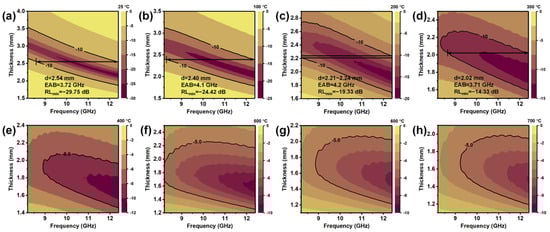 The EMW absorption performance can be more intuitively assessed by reflection loss, which is determined with the complex permittivity. Figure 6 and Table 2 show the variation of RL with frequency and thickness for SiCnw/Si3N4 measured between 25 °C and 700 °C. At 25 °C, the EAB of SiCnw/Si3N4 is 3.72 GHz at a thickness of 2.54 mm and the minimum reflection loss (RLmin) reaches −29.75 dB (Figure 6a). When the temperature increases to 100 °C, the RLmin reaches −24.42 dB, and the EAB broadens to 4.10 GHz at a thickness of 2.40 mm, accounting for 97.62% of the entire X-band (Figure 6b). Furthermore, at 200 °C, the absorption bandwidth of the material in the thickness range of 2.21 to 2.24 mm can cover the X-band (Figure 6c). The improvement in EAB is due to the increased dielectric loss and strengthened frequency dispersion effect of the complex permittivity [44]. However, high permittivity often causes impedance mismatch between the material and free space, causing more EMW to be reflected rather than absorbed at the surface of the material. When the permittivity continues to rise beyond the optimal range, the absorption performance will deteriorate. For instance, as the temperature reaches 300 °C, the absorption bandwidth narrows to 3.71 GHz (Figure 6d). At temperatures above 300 °C, the reflection loss across the entire frequency band exceeds −10 dB, resulting in an absorption bandwidth of 0 GHz (Figure 6e–h). Despite this decline at higher temperatures, the SiCnw/Si3N4 composite ceramics still demonstrate competitive high-temperature EMW absorption performance compared with other materials reported in previous studies (Table 3).