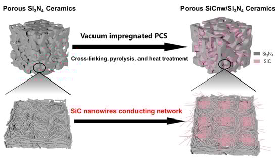 The sintering process of porous Si3N4 ceramics has been reported in detail in previous work [29,30]. The porous Si3N4 ceramic sintered from low-purity A-type Si3N4 powder was placed in PCS solution with a concentration of 25 wt% for 30 min and then transferred together to a vacuum chamber for 30 min to allow the solution to fill the internal pores of the ceramic. Finally, the Si3N4 ceramic impregnated with PCS solution was placed in a tube furnace and successively cross-linked at 200 °C for 2 h, pyrolyzed at 900 °C for 2 h, and heat-treated at 1500 °C for 2 h to obtain SiCnw/Si3N4 ceramics. The atmosphere in the tubular furnace is argon. Similarly, porous SiC/Si3N4 ceramics were obtained by impregnating, crosslinking, pyrolyzing, and heat treating porous Si3N4 ceramics sintered from B-type Si3N4 powder.