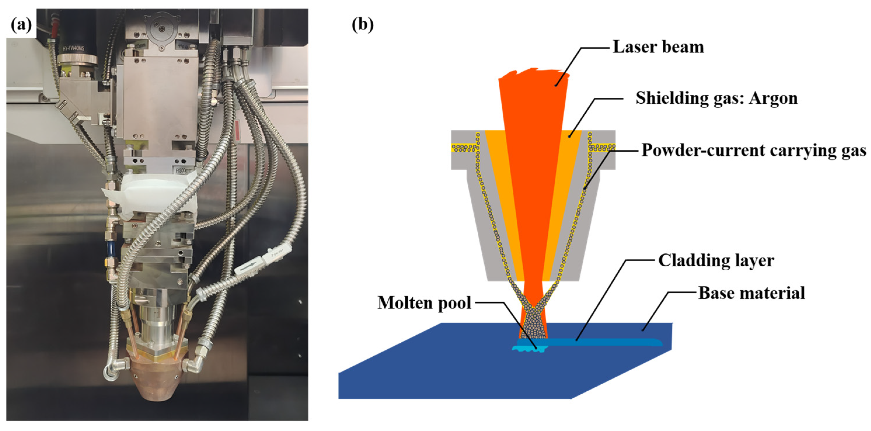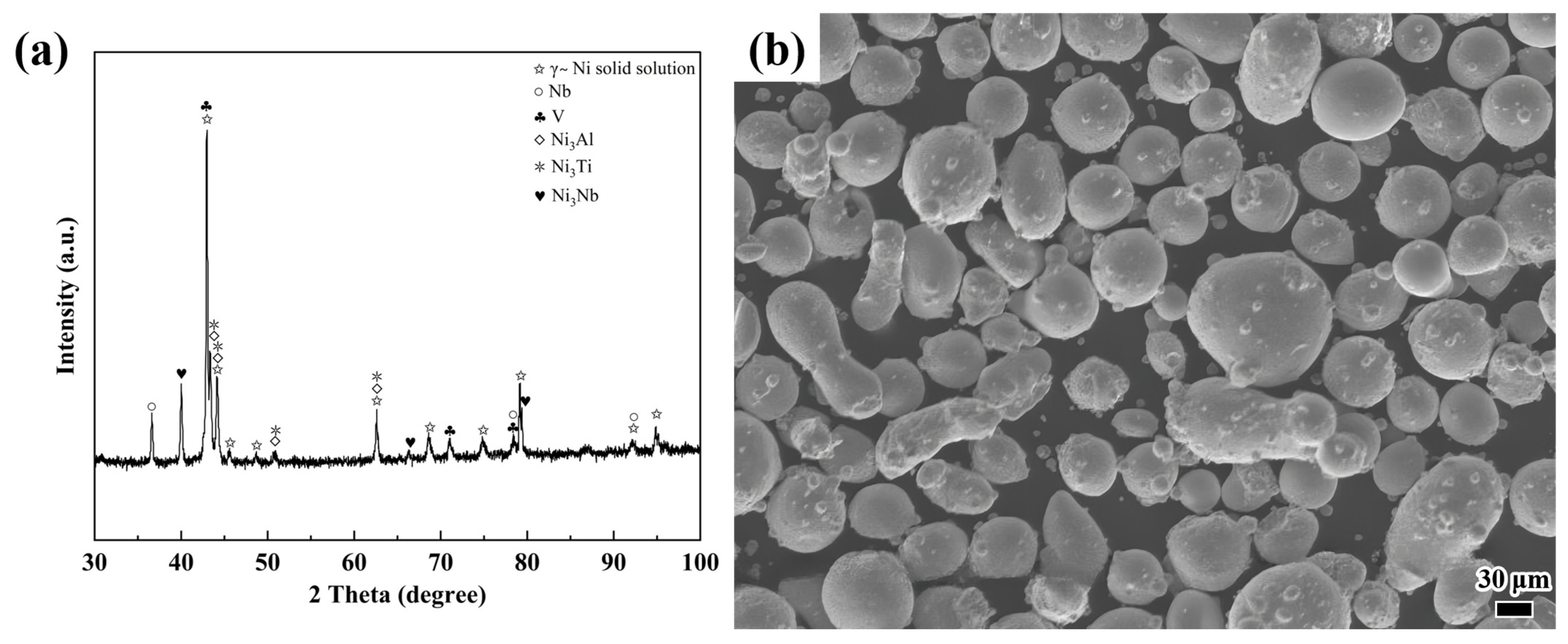 40]. During laser processing, these adsorbed gases are released, leading to pore formation. This is because NiAlNbTiV powder (100–300 μm), due to its fine particle size and active elements, is prone to adsorbing gases and has a very high surface adsorption capacity. In contrast, the defects in other HEAs (for example, WC-enhanced coatings [