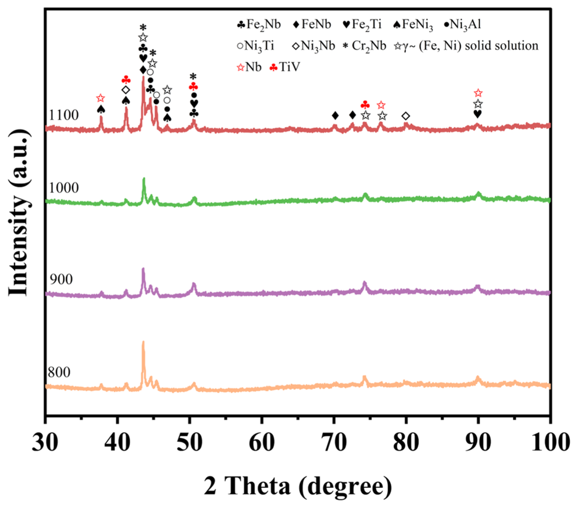 3Nb. Point P1 exhibits the highest Fe content, suggesting the potential formation of a γ-Fe solid solution. Point P2 shows very high Fe and Ni contents with very low Nb contents, indicating the possible presence of a γ-(Ni Fe) solid solution. A small amount of unreacted Ni may exist in solid solution form. Point P3, with a high Nb content, may form Nb-rich intermetallic compounds. By integrating the Ni and Nb content data with the XRD results, it can be concluded that the phase may contain Ni